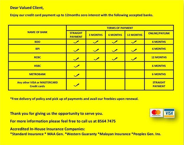 Our Insurance Sales Representatives are ready to assist you with any claims. Take advantage of our tie-up with accredited insurance for faster processing of any claims.